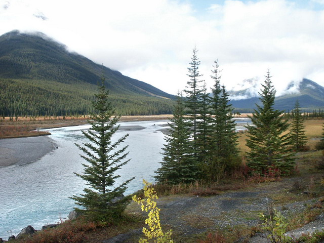 When we passed the Tangle Falls alongside the road I hopped out in the rain for a shot, at the viewpoint of the Sunwapta Canyon the view was temporarily unavailable *rolleyes*. And in the Columbia Icefield area we got snow! We could barely see where the Athabasca Glacier was (normally you’d have a good view on it from the road), because everything was swallowed by the fog, or rather, the (wet) snow. The snowflakes got bigger and bigger but it wasn’t cold enough to make the landscape white. When we came around the corner of the Parker Ridge (just before the Big Bend): POOF! it was gone! A few minutes later we were driving in the sun again ๐ After the Bend we drove through a narrow part of the valley, I think I like that part the most! The mountains are so close. Near the Waterfowl Lakes we entered another shower, rain at first and by the time we were at Peyto Lake it was snow again! There was really no view at all, the road itself is at its highest point there. A bit later we drove out of it and came to a point where we had the most beautiful view over the valley with the blue river streaming through meadows with colorful vegetation, awesome! Even a bit of sunshine there. A bit further we stopped at the Num-Ti-Jah Lodge at the side of the Bow Lake. Again a very beautiful location, despite the next shower we were slowly getting into. We had a coffee at the coffee bar in the gift shop and continued our drive to Lake Louise. Shortly after 4 we arrived at the campground. Yet another nice spot in the forest. After this long drive (234 km) we deserved a night out in the town ๐ So we went to the “village” and had dinner at the Lake Louise Village Grill & Bar ๐